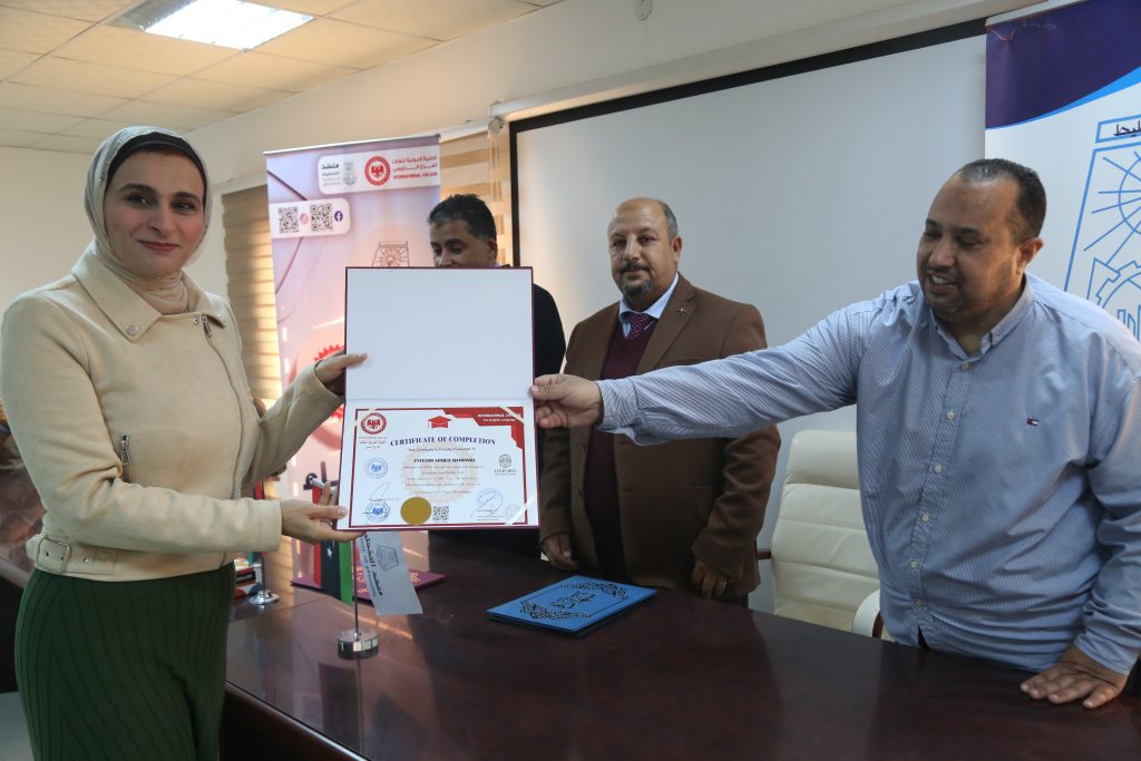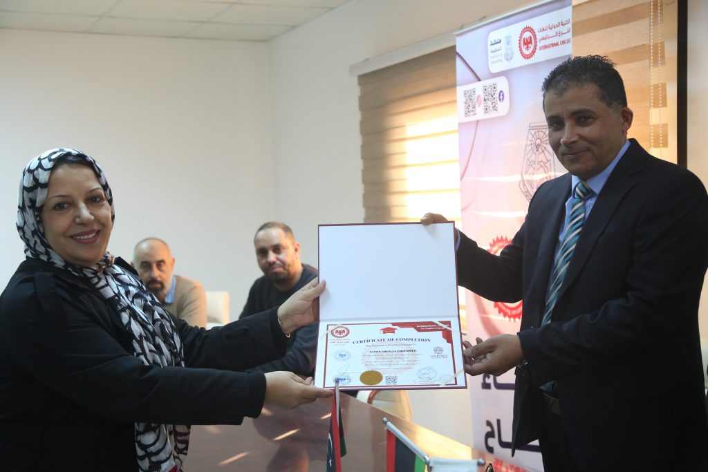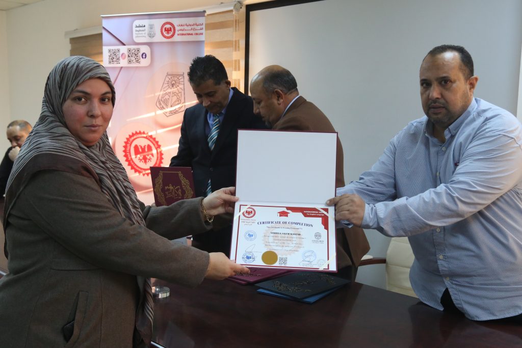 وفي ختام الحفل، تم توزيع شهادات إتمام الدورة على المتدربين، كما قُدمت شهادة شكر وامتنان للأستاذة إلهام البوعيشي تقديرًا لجهودها وإشرافها المتميّز طوال فترة التدريب.