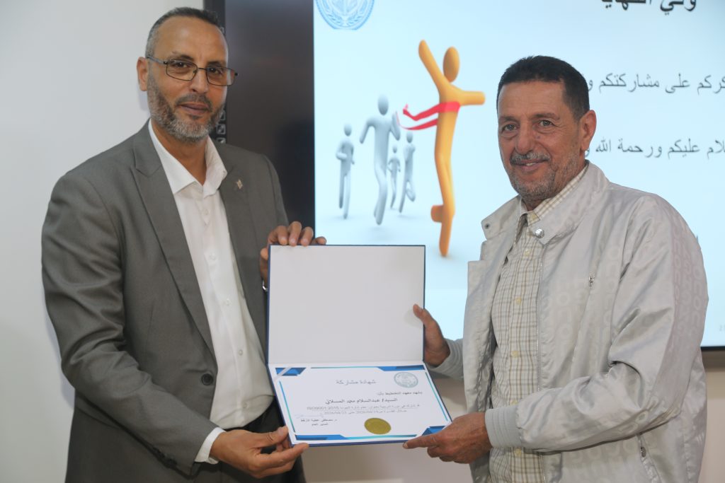 اختتمت اليوم الخميس بمقر معهد التخطيط فعاليات الدورة التدريبية المتخصصة في نظم إدارة الجودة ISO 9001:2015، والتي استهدفت عددًا من موظفي مكتب مراقبة التعليم بتاجوراء، واستمرت لمدة خمسة أيام متتالية، ضمن برامج التأهيل ورفع الكفاءة الإدارية، وقدّمها المهندس محمد عياد.